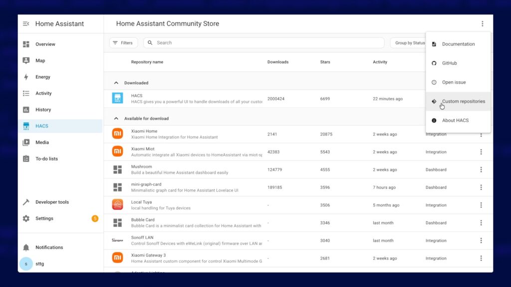 - From within the HACS interface, click on the three dots in the top-right corner to open the menu.