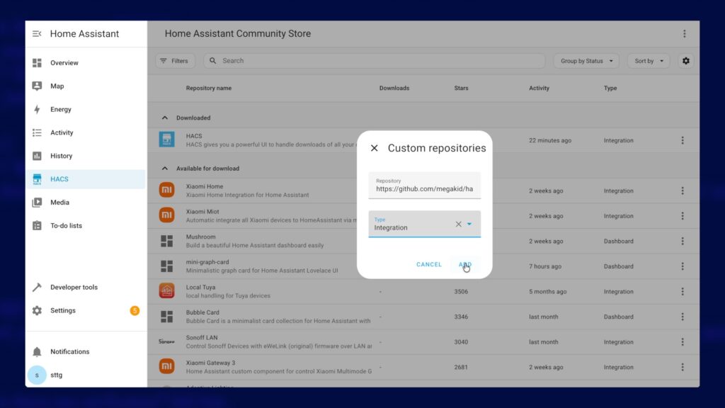 Follow that guide and once HACS is up and running you need to tell it where to find Hildebrand Glow integration: