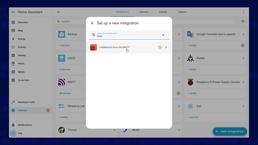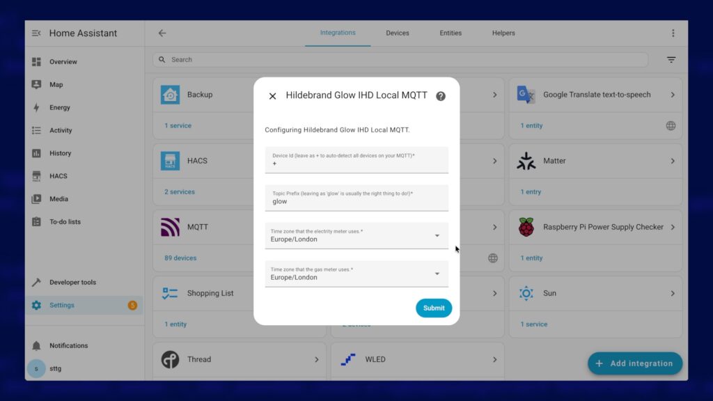 Back in Home Assistant, navigate to Settings > Device & Services. Click on the Add Integration button and search for "Hildebrand Glow IHD MQTT". Select the item from the list and it should open up the configuration page. No additional configuration should be required under most circumstances so you should be ok to accept the default options and click on Submit.