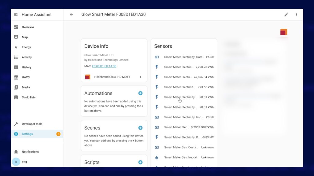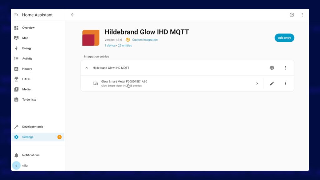 - Install HACS and the Hildebrand Glow Integration