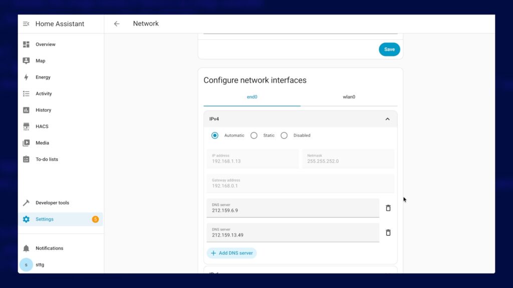If Home Assistant is connected using a wired network cable to your home network, look under the tab named 'end0', but if it's on WiFi then select the tab named 'wlan0'. Those interface names are valid for a Raspberry Pi, so if you're using a different bit of hardware then the names may be slightly different but still as obvious (WLAN = Wireless LAN; ETH / END = Ethernet cable). When you've selected the correct tab, expand the IPv4 . You should see the IP address displayed in the IPv4 section and make a note of the IP address in the 'IP address' field.
